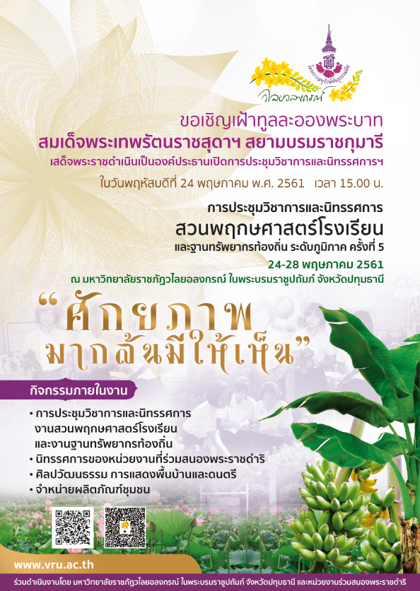 การประชุมวิชาการและนิทรรศการ สวนพฤกษศาสตร์โรงเรียน และฐานทรัพยากรท้องถิ่น ระดับภาค ครั้งที่ 5 ขอเชิญเฝ้าทูลละอองพระบาทสมเด็จพระเทพรัตนราชสุดาฯ สยามบรมราชกุมารี เสด็จพระราชดำเนินเป็นองค์ประธานเปิดการประชุมวิชาการและนิทรรศการฯ ในวันพฤหัสบดี ที่ 24 พฤษภาคม 2561 เวลา 15.00 น. ณ มหาวิทยาลัยราชภัฏวไลยอลงกรณ์ ในพระบรมราชูปถัมภ์ จังหวัดประทุมธานี